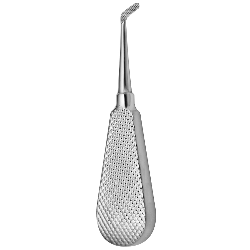 Utilisé comme levier pour l'extraction d'une dent ou des racines retenues. Il est poussé entre la gencive et la partie externe de la dent et utilisé pour détacher les tissus entourant la dent. La lame transmet une force, générée par la rotation du manche autour de son axe long, à la surface de la dent ou de la racine. Cela produit le déplacement de la dent à partir du point d'application où l'élévateur entre en contact avec la dent. La force peut être appliquée perpendiculairement à la dent, l'élévateur étant placé dans l'espace interdentaire, ou le long de son axe long. Comme une force considérable est appliquée à la dent, il est nécessaire d'empêcher l'élévateur de glisser. Pendant son utilisation, l'index de l'opérateur doit donc être étendu sur la longueur de la lame pour servir d'appui sur les tissus durs adjacents. La lame incurvée de l'élévateur est placée sur la surface de la racine, se trouvant ainsi entre la dent et l'os alvéolaire qui agit comme un point d'appui autour duquel l'élévateur est tourné. La rotation de l'élévateur produit une force qui disloque la dent et tend à la faire sortir de son orbite. Une force égale sera également appliquée au point d'appui, il est donc important de s'assurer que cet os alvéolaire est capable de résister à une telle force et qu'il ne s'agit pas d'une dent adjacente qui pourrait, par inadvertance, se détacher ou se déplacer. Les élévateurs doivent être utilisés avec prudence lors de l'extraction de dents afin d'éviter de générer des forces excessives et potentiellement dommageables.
