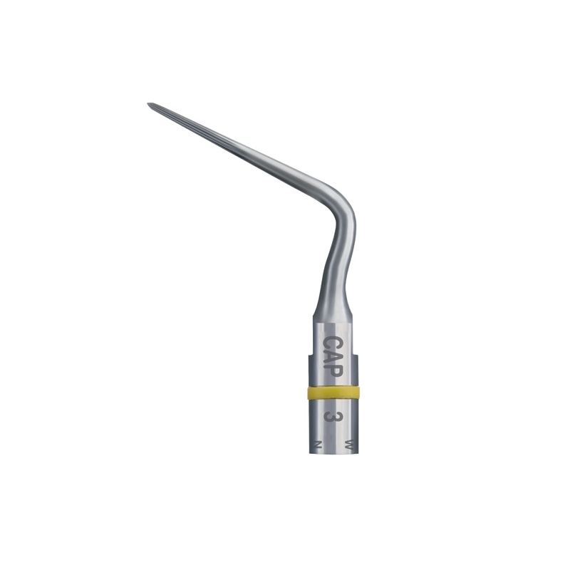 CAP2 - PRÉPARATION DE LA CHAMBRE PULPAIRE : Insert micro-lames, longueur 9 mm, conicité 5%. L’insert CAP2 a une partie latérale et une pointe actives et s’utilise par méthode de balayage pour éliminer les ponts dentinaires.